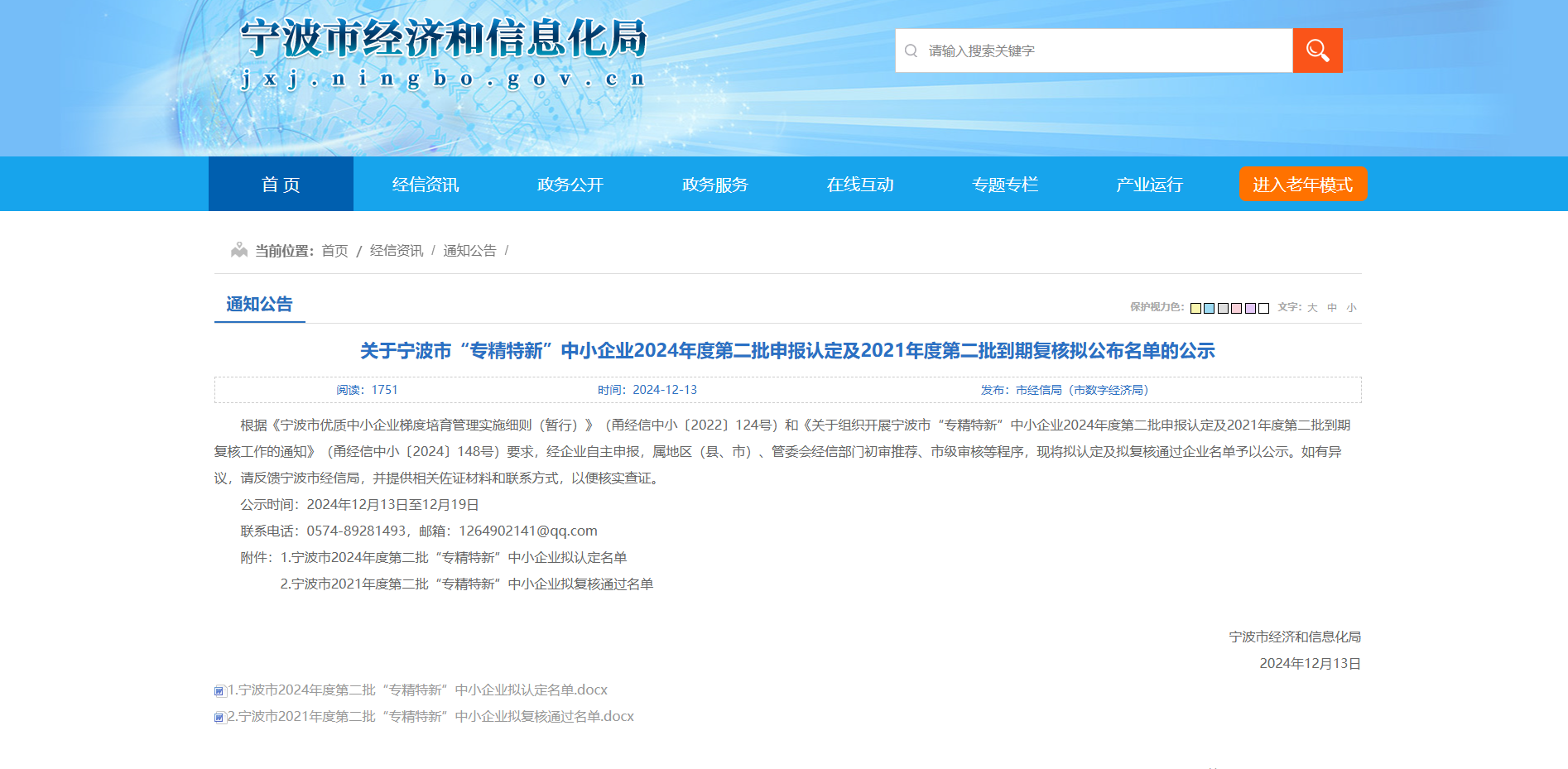 近日,寧波市經濟和信息化局正式公布了《關于寧波市“專精特新”中小企業2024年度第二批申報認定及2021年度第二批到期復核擬公布名單的公示》。